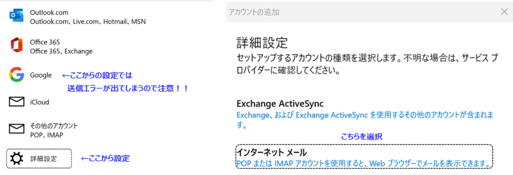上記設定の次は下記の設定。Googleからの設定では送信エラー出るので注意。