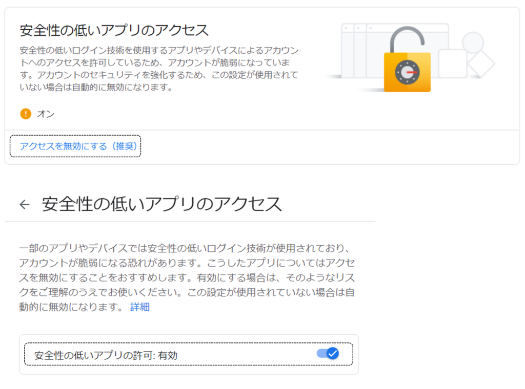 結局、Googleのアカウント管理のアクセスセキュリティを低く設定することで